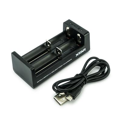 Le XTAR MC2 est un chargeur double Accu permettant la charge de tous types de batterie IMR ou Li-Ion. sa rampe de chargement est adaptable à la majorité des batterie ( du 14500 au 26650).